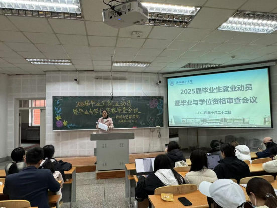 经济与管理学院高度重视学生毕业和就业工作,严抓学生培养和就业质量提升工程,结合学校开展2025届毕业生秋季双选洽谈会和学校教务处关于开展2025届毕业生毕业与学位资格审查相关工作通知,10月22日,经济与管理学院在瑞师楼124教室召开2025届毕业生就业动员暨毕业与学位资格审查会议,会议由2025届本科生毕业生辅导员刘伟老师主持,教学秘书孟丽老师和全体毕业生参加会议。