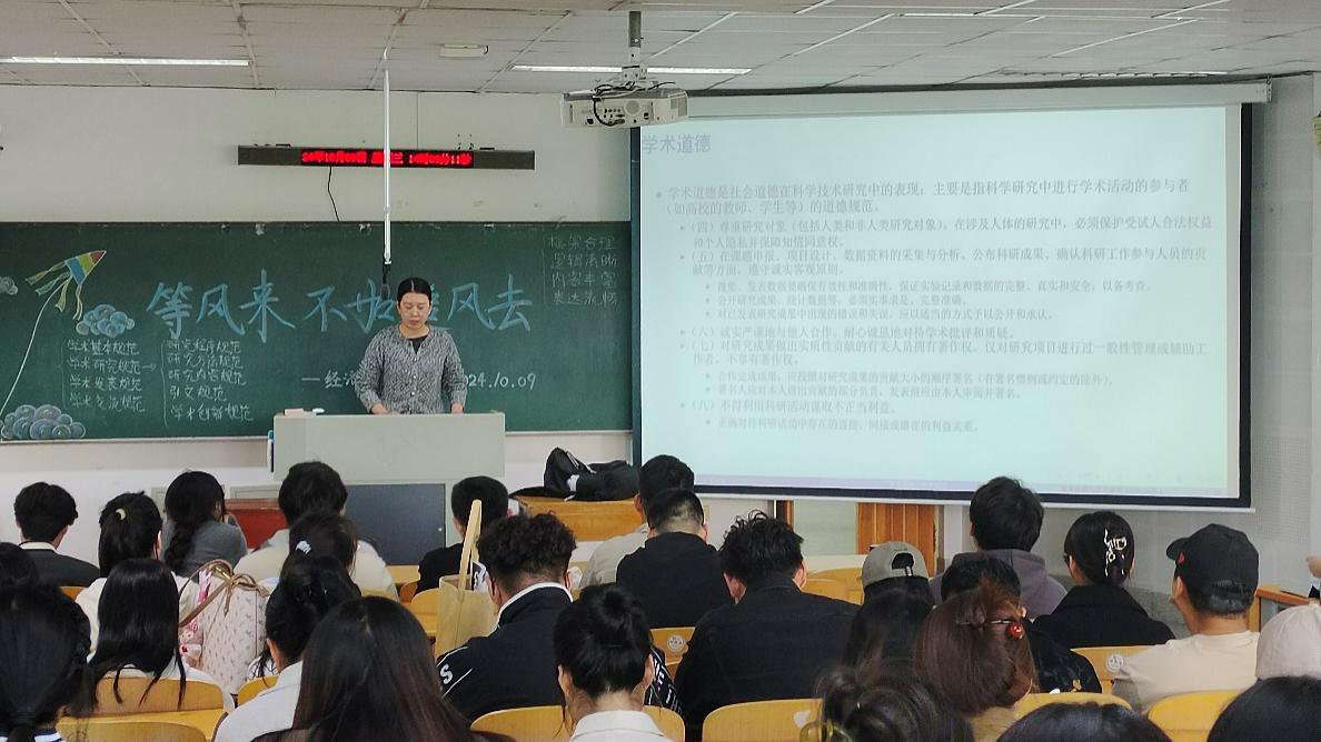 为做好研究生新生学术道德与规范的教育工作,引导他们树立正确的学术道德观念,经济与管理学院于10月9日举办了学术道德与规范专题讲座。讲座由研究生辅导员刘璐主持,教师王颖主讲,经济与管理学院2024级全体研究生新生参加。