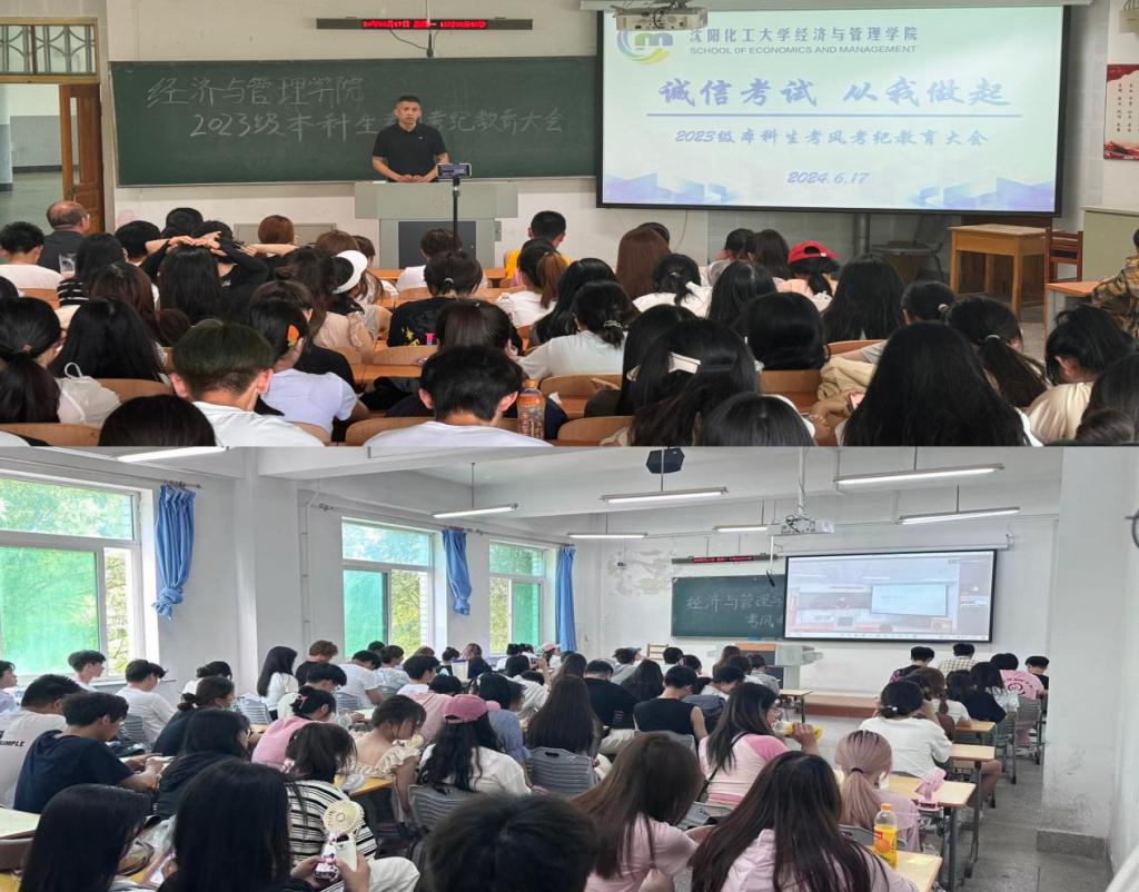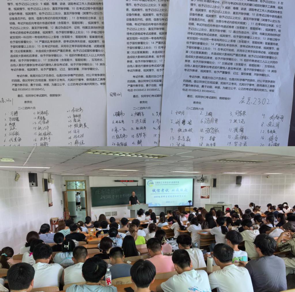 为进一步加强考风考纪教育,深入推进我院学风建设工作,倡导“严肃考风考纪、弘扬优良学风、文明诚信应考”,增强同学们的诚信考试意识,保证考试的公正性,端正同学们的学习和考试态度。6月17日下午,“诚信考试,从我做起”2023级本科生考风考纪教育大会在通明楼232、213教室举行,大会由2023级辅导员王怀老师主持,经济与管理学院党委书记李丙文主讲,2023级全体学生参会。