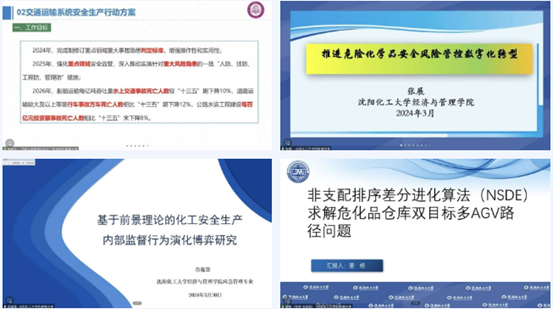 经济与管理学院副院长刘铁民主持会议第二单元。经济与管理学院张展老师以《推进危险化学品安全风险管控数字化转型》为题,介绍了化工和危险化学品安全生产治本攻坚三年行动方案(2024-2026年),对推进危险化学品安全风险管控数字化转型工程展开剖析,梳理了近三年政府出台的相关指导意见和实施方案,最后提及新质生产力与石化行业数字化转型、设备更新升级。经济与管理学院苗蕴慧老师以《基于前景理论的化工安全生产内部监管行为演化博弈研究》为题,引入2023年国内十大化工事故,采用演化博弈的方法并结合前景理论,构建管理者和员工的演化博弈模型,借用MATLAB将主体行为选择的过程可视化,通过仿真模拟解释关键因素对主体行为选择的影响,并运用模型来研究提高化工企业内部监管的举措。经济与管理学院研究生姜杨以《非支配排序差分进化算法(NSDE)求解危化品仓库双目标多AGV路径问题》为题,对AGV工作流程说明、多目标优化问题、混合整数规划模型、非支配排序差分进化算法、编码解码进行讲解,引入NSCA-II的快速非支配排序方法和经营选择策略,最后将NSDE与GUROBI、MOTS进行比较以证明算法的有效性。