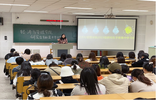 为扎实推进研究生新生入学教育,使研究生明确校规校纪,规范言行举止,强化学生规则意识,提高自我管理、自我学习和自我发展的能力,经济与管理学院开展了2023级研究生《研究生手册》专题学习活动。