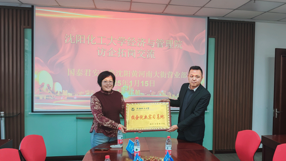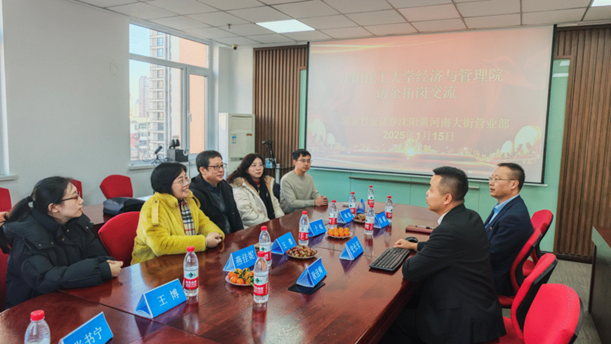 2025年1月15日,沈阳化工大学经济与管理学院院长王蓉、金融学教研室主任于铭、专业教师周颖、燕佳妮、毕业生辅导员、在读研究生等一行7人前往国泰君安证券沈阳黄河南大街营业部开展访企拓岗活动,与营业部总经理史长安、党支部书记徐鹏、业务骨干耿佳帅进行交流探讨。