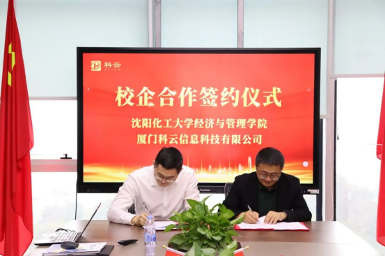 在交流过程中,双方就建立长期稳定的实习基地、开展产学研合作项目以及共同申报科研课题等合作意向进行了探讨,并初步达成了合作框架,并举行了“实习就业基地共建 校企合作”签约仪式,校企双方均表示将积极整合资源,发挥各自优势,为学生创造更多的实习实践机会与就业岗位,实现校企互利共赢、协同发展的目标。沈阳化工大学经济与管理学院副院长刘铁民、教师代表陈丹、徐婧玥,厦门科云信息科技有限公司院校事业部副总经理林英耀、辽宁省总经理胡火坤、科云教育研究院副院长林剑平等参加了签约仪式。