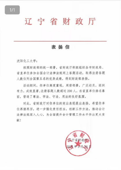 日前,辽宁省财政厅向我校经济与管理学院发来表扬通知,对该院精心组织并扎实推进的会计法律法规专题学习及网上答题活动给予高度评价和表扬。省财政厅特别指出,学院对此项活动高度重视,周密部署,广泛动员,组织有力,成效显著,在省直单位排名靠前,营造了尊法、学法、守法、用法的良好氛围。