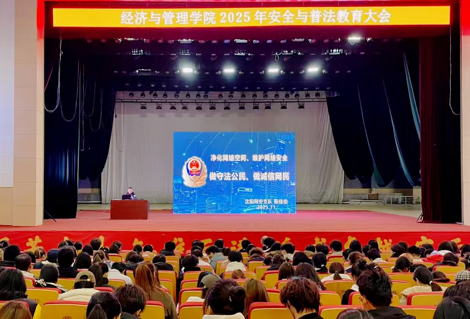 为全面提升师生安全防范意识与法治观念,努力营造安全、稳定、清朗的校园环境,经济与管理学院于11月4日在大学生活动中心成功举办2025年安全与普法教育大会。学院党委书记李丙文、沈阳市公安局网络安全保卫支队警官陈佳佳、学校保卫处相关负责人以及学院本科、研究生等1000余名师生代表出席会议。