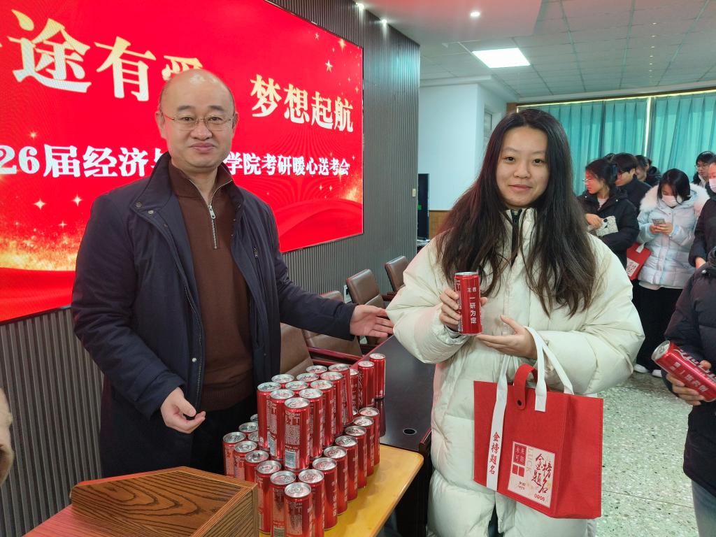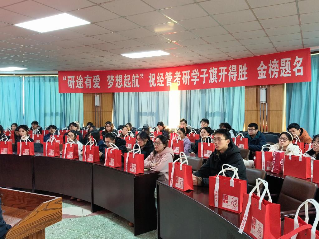 寒冬岁末,温情洋溢。为切实助力2026届考研学子从容应考、逐梦前行,12月16日,经济与管理学院在通明楼311报告厅成功举办“研途有爱,梦想起航”暖心送考会。学院党委书记李丙文、副书记关婷、副院长刘铁民出席活动,2022级辅导员齐伟主持会议。