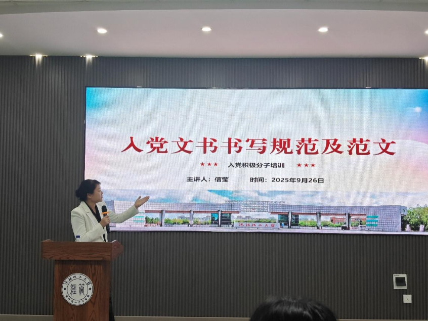 为切实提高入党积极分子的入党文书撰写水平,端正其入党态度,帮助积极分子明确入党培养流程与自身职责,9月26日晚6:00,经济与管理学院于通明楼311报告厅开展2025年秋季积极分子培训党课“入党文书书写规范及范文”专题培训。本次党课由学院组织员信莹主讲,全体入党积极分子参会学习。