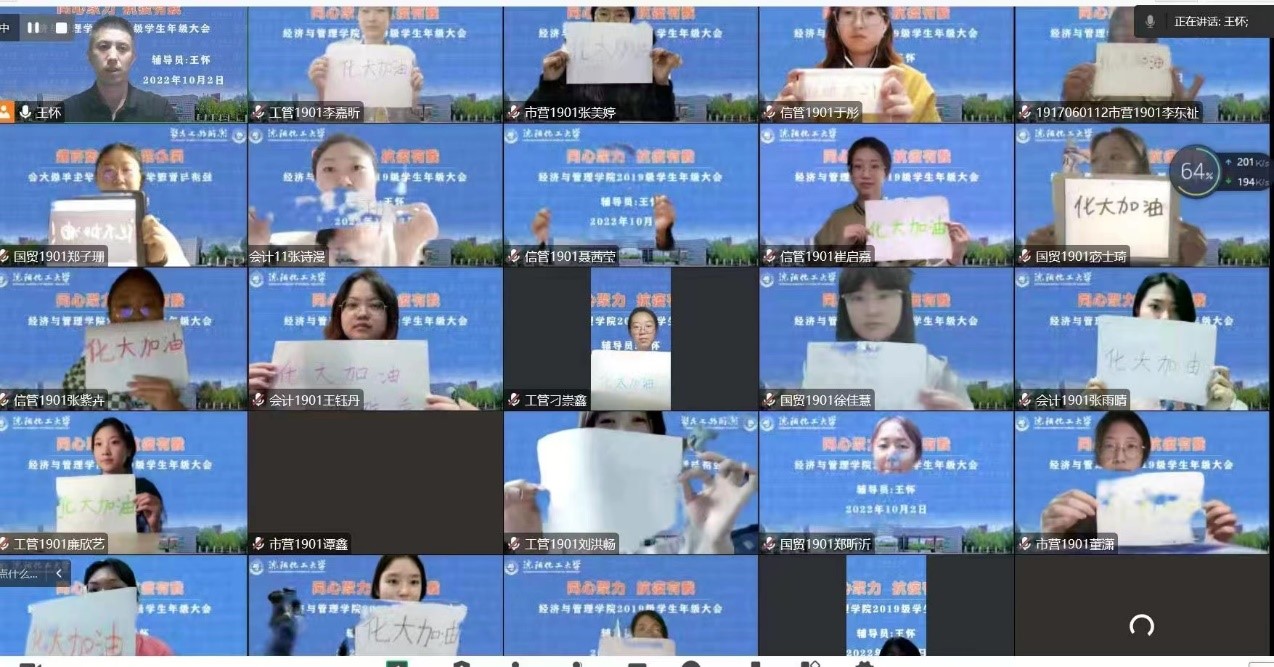 本科四年级组织召开以“同心聚力 抗疫有我”为主题的年级大会,辅导员王怀老师首先向学生详细介绍了全体教职员工为做好校园静默管理疫情防控所开展的系列工作,引导大家要不断增强感恩之心,而后针对接下来的疫情防控工作对全体同学提出了三点要求:一是要时刻保持理性思维,以积极阳光的心态克服特殊时期的困难;二是要全体同学提高政治站位,全力配合做好健康监测、体温日报、中高低风险地区排查等常规工作;三是要合理规划好时间,利用好有效的空间,调整好就业心态,高效就业。王怀号召大家要充分发挥先锋模范作用,积极带头做好各项防疫工作。全体同学将对化大的爱与祝愿绘于纸上——“化大加油”。