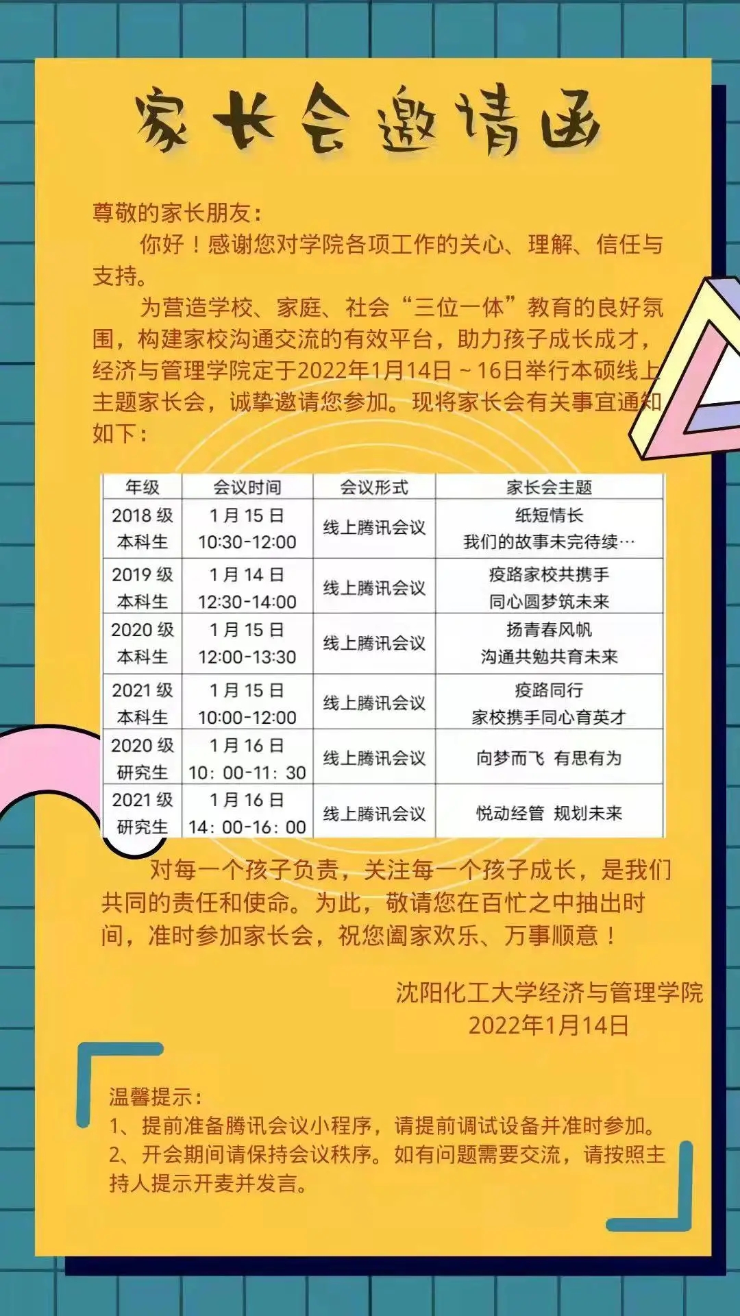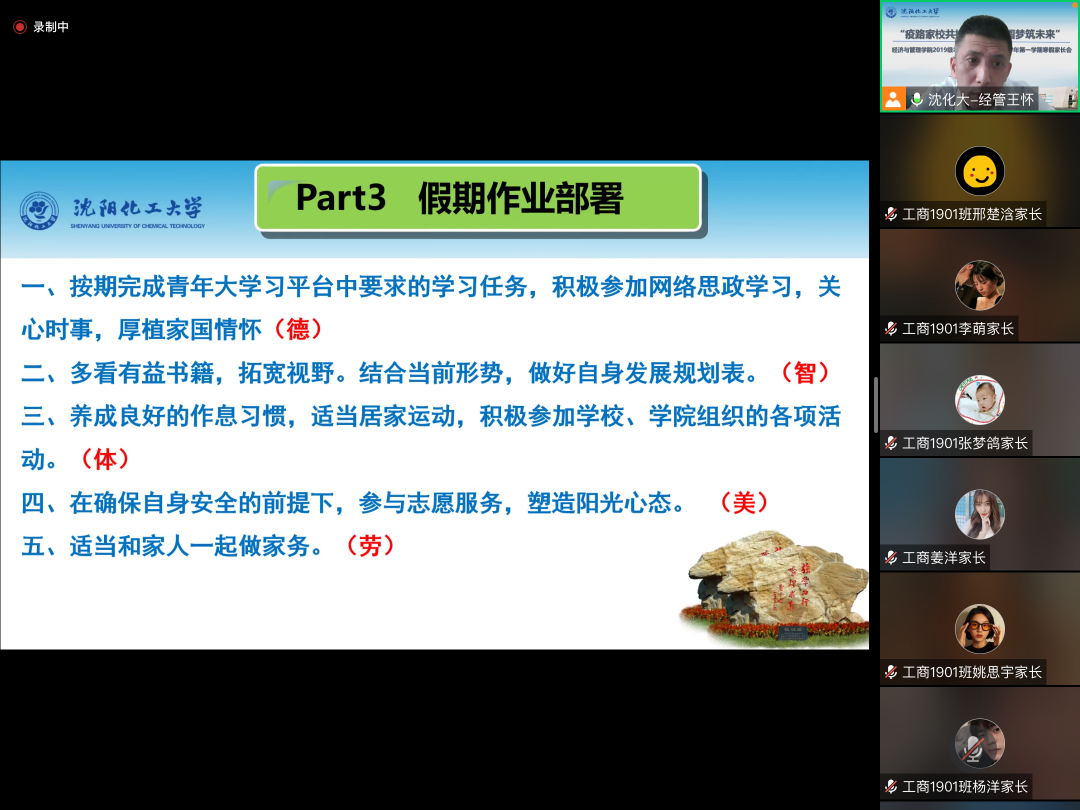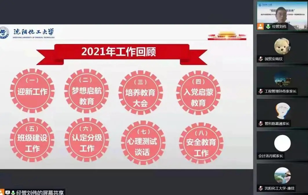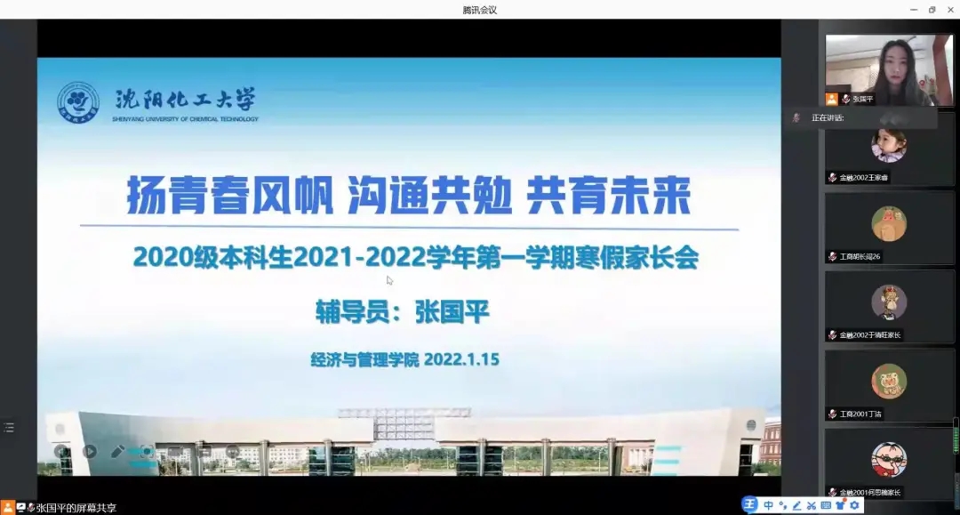 为进一步加强家校沟通,促进家校合作,2022年1月14日至16日,沈阳化工大学经济与管理学院线上主题家长会正式开启,全国各地的1460个家庭,通过互联网齐聚“云”端。本次家长会由学院统一部署,制定线上家长会方案,突出年级和阶段特点,精心策划会议内容。