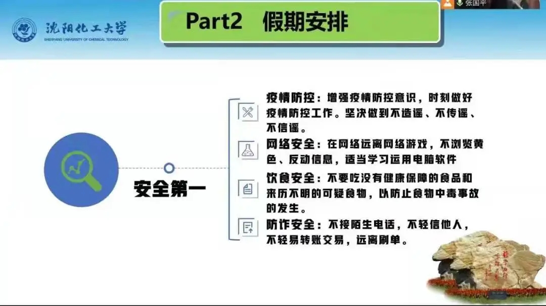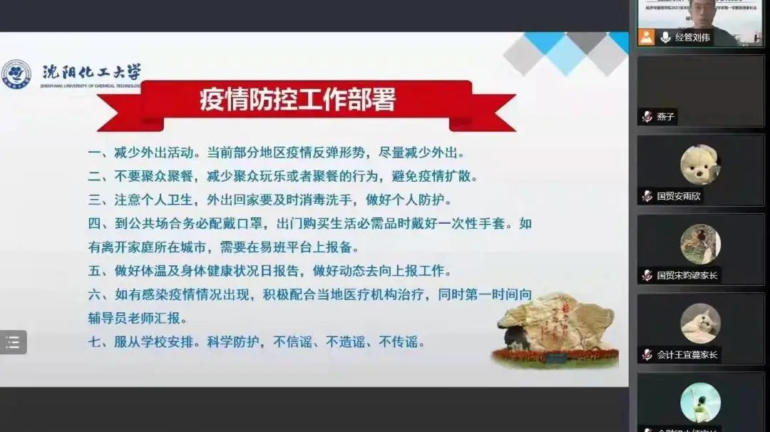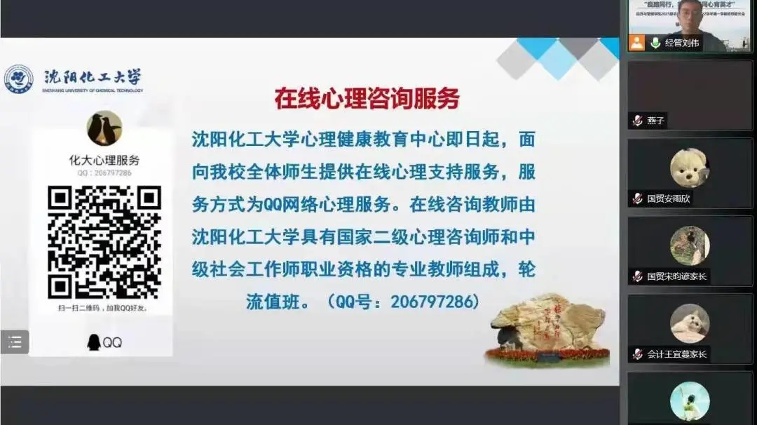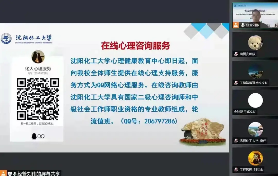 2021级新生入学刚满一学期,再次与家长网络相聚,倍感亲切。辅导员刘伟老师首先为家长介绍了2021级学生在校学习、生活情况,分享了孩子们的成长瞬间,着重强调疫情防护和假期安全。他动员学生,寒假期间,要积极参加家乡的社会实践活动,积极参加体育锻炼,注意防盗防骗等。会后,家长们纷纷在家长群内自发地分享对学校、学院、老师的感激之言。
