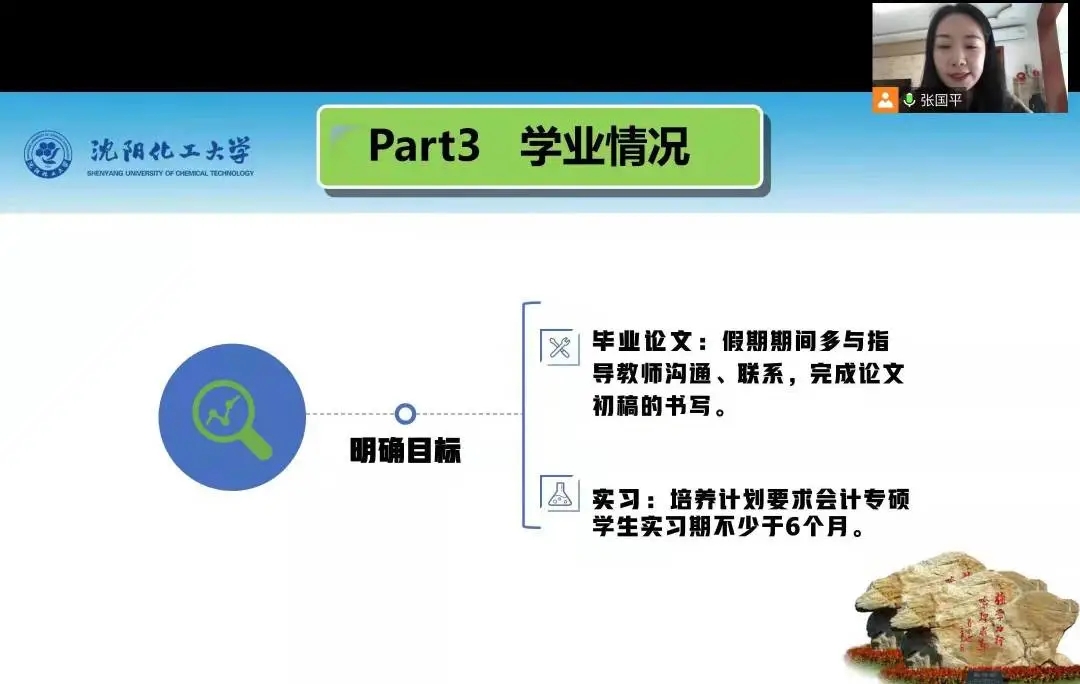 家长会前,辅导员张国平老师精心设计了家长会邀请函,并提前发送给家长,从PPT设计到设备的调试都进行了精心准备。张老师重点对学业、学情进行了分析,尤其是学院后进生的转化工作,并对学业预警政策进行详细解读,目的就是不让一个孩子掉队。她从德智体美劳五个方面向家长图文并茂地进行介绍,希望学生利用学校、学院提供的多彩锻炼平台充分展示和锻炼自己。她全面介绍了各项科创赛事,希望激发学生参赛积极性,通过“学校+家长”共同努力,促进学生能力的提升。针对未来规划等家长们最关心的热点问题,张老师与家长展开了沟通交流,虽然隔屏相望,但推心置腹、气氛热烈。此次家长会,进一步拉近了家校距离,建立了家长与学校在教育管理上的共识。