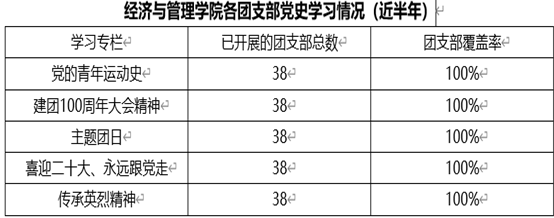 2018年至今,在学院党总支和上级团组织的正确指导下,经济与管理学院坚持以服务人才培养目标为中心,充分依托团员思想引领和服务成长两条主线,持续开展了“德育和理想信念教育、校园文化建设、创新创业实践、社会实践与志愿服务,基层团组织建设”等五个模块的系列建设活动,取得了辉煌的成绩。学院分团委分别在2018年、2019年、2022年获得校“年度进步团委”、“五四红旗团委”、“先进团委”等多项荣誉。2018年以来,在“两优一先”评选中,学院始终秉持公平、公正、公开的原则,共评选出“先进团支部”22个,“优秀团干部”33人,“优秀团员”132人。1人获评中国电信奖学金,1人获评中国大学生自强之星奖学金,3人获评市级以上“优秀团干部”称号。此外,依托学院“红色文化教育基地”,在原有“毕业季晚会”、“科技节”等品牌活动基础上又打造了“红歌赛”、“红色之旅”社会实践、“红色理论宣讲”等特色活动。