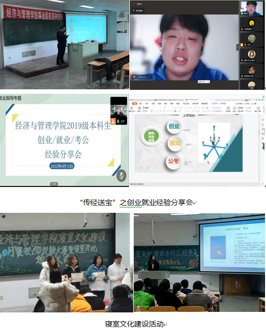 校园文化建设是全面实施素质教育的有效载体,对学生的人生观、价值观产生着潜移默化的深远影响,而这种影响往往是任何课程所无法比拟的。健康、向上、丰富的校园文化对学生的品性形成具有渗透性、持久性和选择性,对于提高学生的人文道德素养,拓宽同学们的视野,培养人才具有深远意义。经济与管理学院在引导学生融入校园文化中始终坚持“传统+创新”的模式。连续举办了学风建设系列交流会、寝室文化建设、毕业季爱心捐赠等传统活动外,还精心打造了毕业季晚会、红歌赛等创新性文艺活动。在体育类活动方面,学院也是连续在校运动会中获得佳绩。尤其是在疫情期间,全院师生齐助力,利用网络开展了“手绘抗疫作品”征集、录制祝福视频等多项活动。