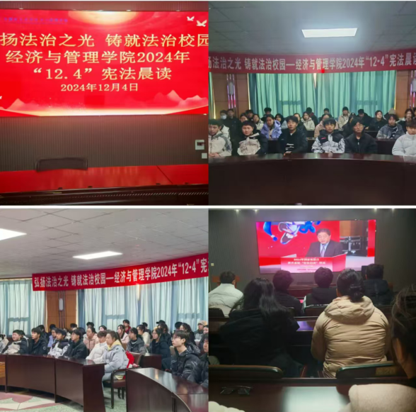 为了引导学生深入学习宪法法治知识、增强宪法法治观念、树立宪法法治意识,提升法治素养,按照教育部印发的《关于开展2024年教育系统“宪法宣传周”系列活动的通知》以及省“宪法宣传周”有关部署要求,12月4日,经济与管理学院组织全院师生共同观看了全国教育系统“宪法晨读”直播节目,并同步参与了宪法学习环节。
