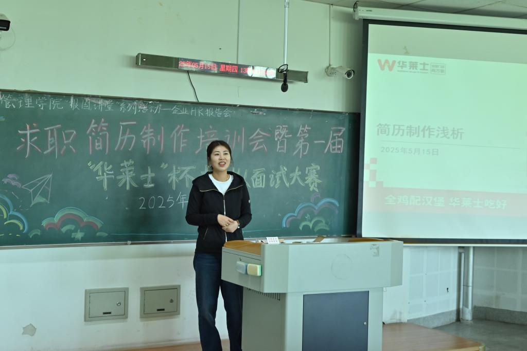 5月15日,经济与管理学院在通明楼338室举办了“报国讲堂”大学生职业规划与就业指导主题讲座暨求职简历制作培训会。本次活动特邀上海华莱士贸易有限公司沈阳分公司人事主管姚琳女士担任主讲。2022级本科生、2023级研究生参加讲座,本次活动由学院分团委书记王怀主持。